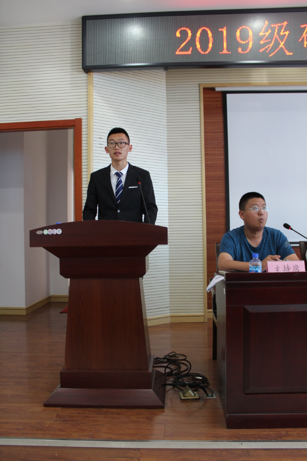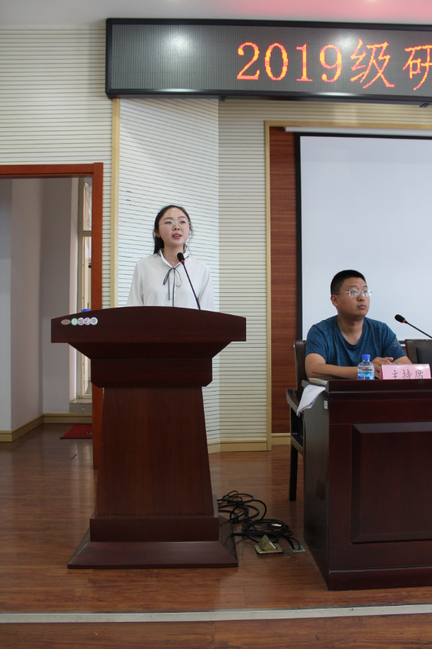 然后是在校研究生代表2018级研会主席王畅同学发言,她向2019级新入学的同学们表示欢迎,并希望与全体新同学一起成长,共同进步;2019级新生代表路冠中同学表示在研究生三年学习生活中将砥砺前行,牢记“育土木人,塑土木魂,聚土木情,兴土木业”的院训。