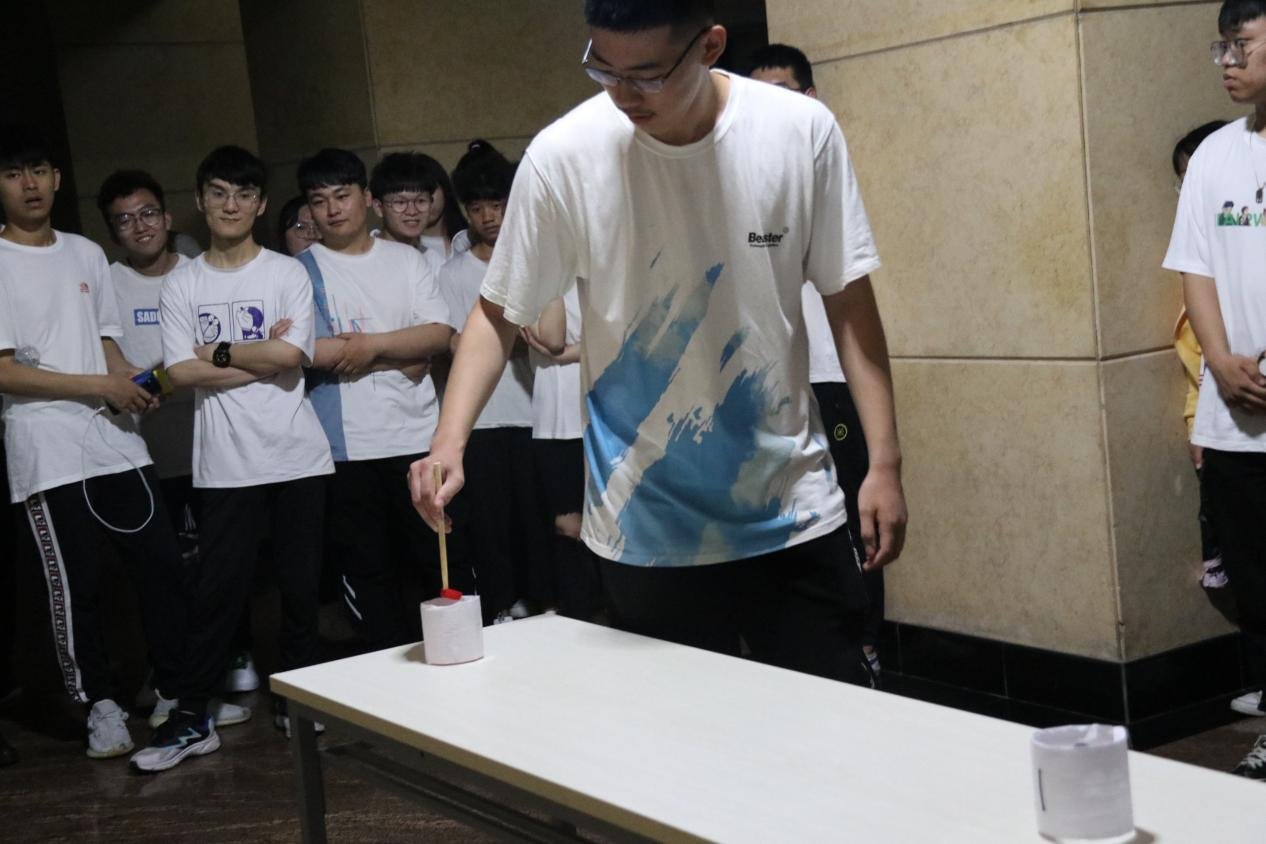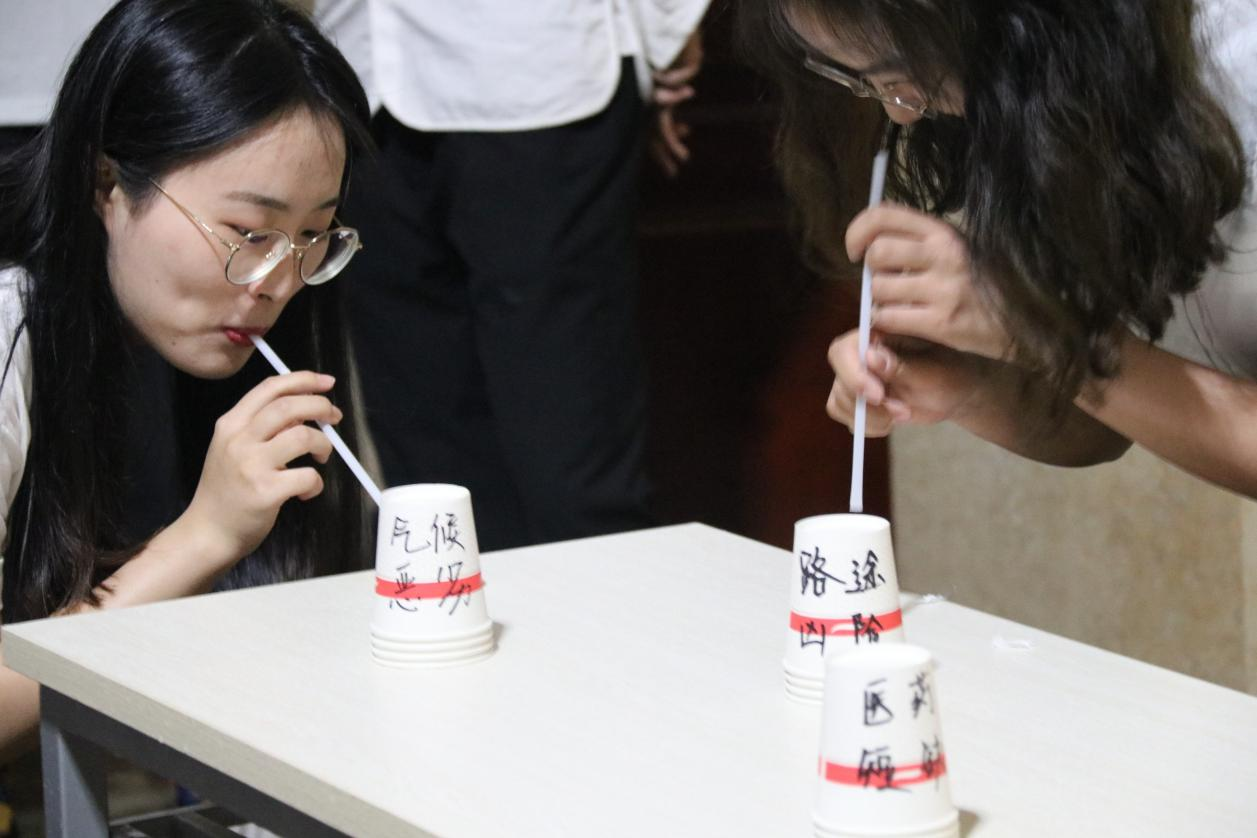 活动开始时,二人随机组队 PK,分别将 10 颗弹珠依次从杯子一(2021 年)夹至杯子二(2035 年)、杯子三(本世纪中叶),并抽取一道党史题目回答。比赛时气氛十分火热,同学们争分夺秒完成任务,抢答问题。紧张的氛围提醒同学们在新时代发挥先进带头作用,为国家开启新征程的建设添砖加瓦。