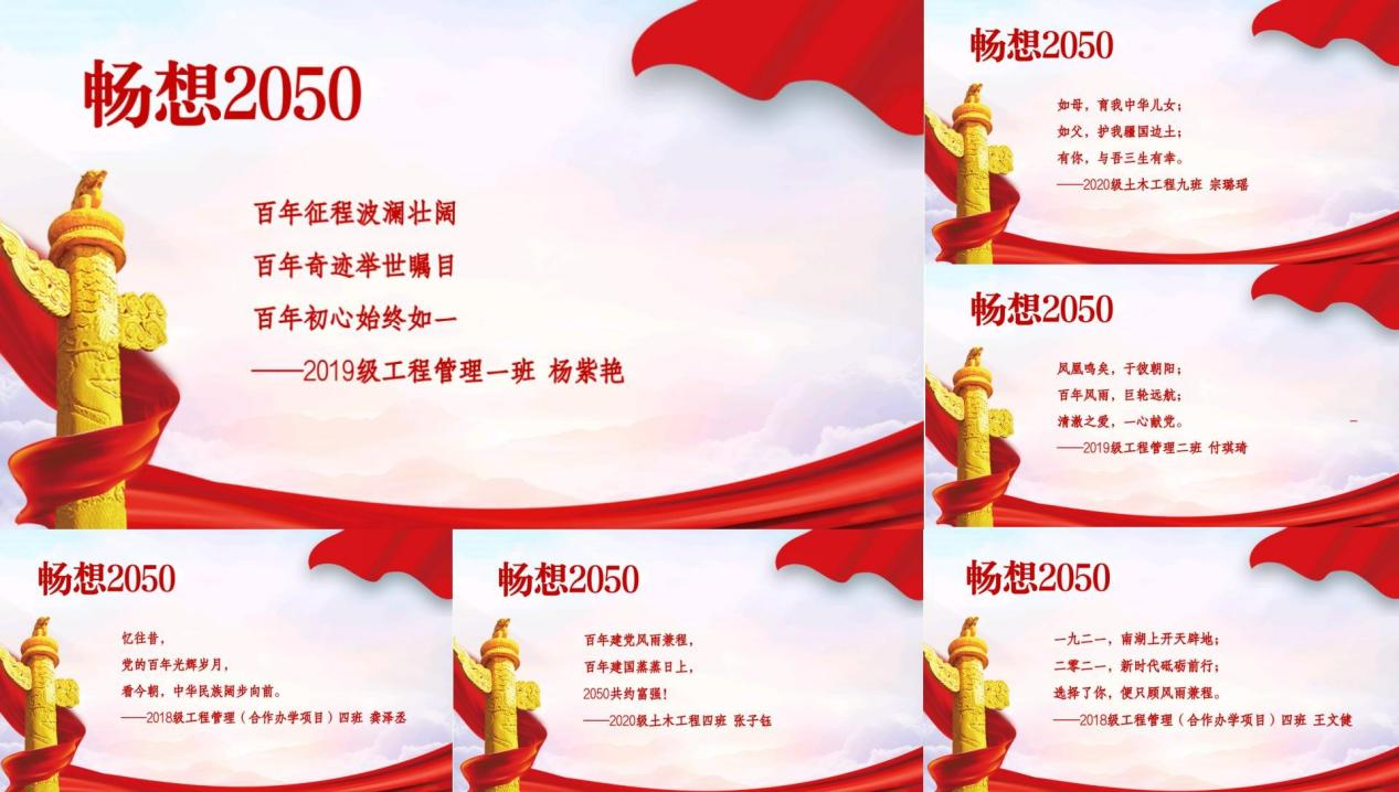 在建党一百周年之际, 土木青年学子原创三行请书献给党。一句句饱含深情的文字,一行行对党和国家的祝福此刻被定格,诉说百年征程,描绘未来蓝图,无形的情感化作有形的热爱,用三行情书畅想百年,用拼搏奋进铸就华章。