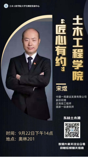 9月22日14:00,yl23411永利集团官网“匠心有约”第三期活动在奥林201成功举办。本次活动邀请到了我院1994级建筑工程专业校友、中建一局建设发展有限公司副总经理宋煜,一局建设发展公司员工团队以及yl23411永利集团官网师生参加活动。本次活动由yl23411永利集团官网党委副书记、副院长孙维国主持。