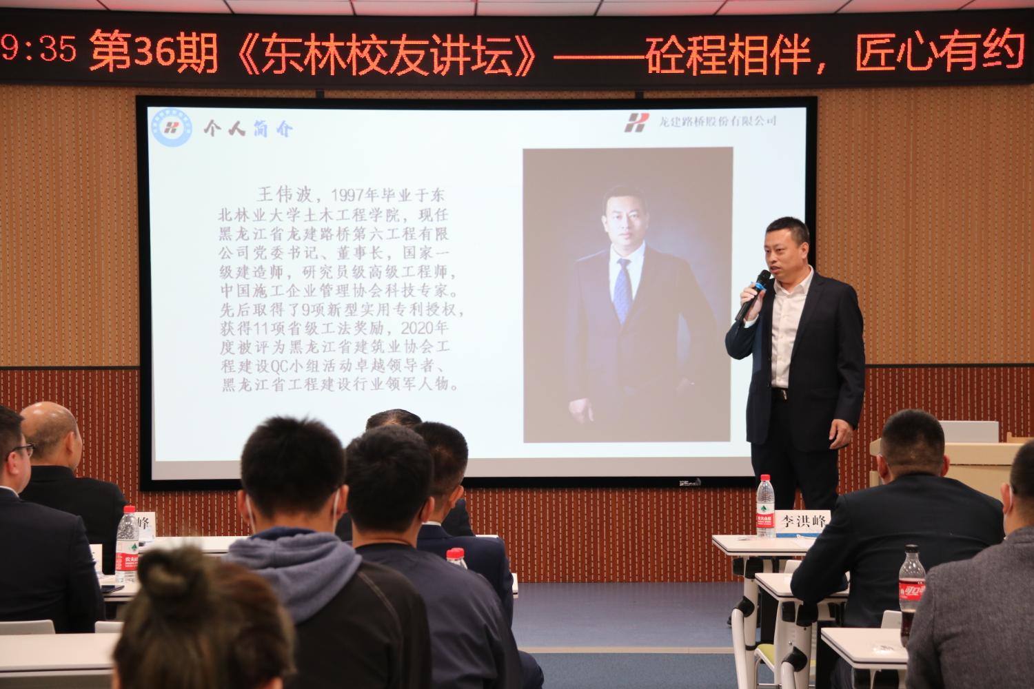 【主讲人:王伟波】,现任黑龙江省龙建路桥第六工程有限公司党委书记、董事长,中共党员,国家一级建造师,正高级工程师,1997年毕业于我校yl23411永利集团官网,毕业后就职于黑龙江省龙建路桥第六工程有限公司,历任公司副总经理、项目经理、项目副经理等职务。