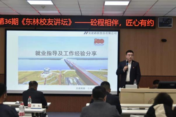 史伟鉴校友结合自己工作以来对工程项目的坚守谈起,工作以来,一直坚守在桥梁施工一线,累计参加、主持建造大中小桥梁80余座,先后参加前嫩高速、建黑高速、浓抚及抚黑公路工程、中俄黑龙江大桥、哈肇高速建设,参加主持建造的中俄黑龙江大桥项目是黑龙江省首批“品质工程”示范项目,发表了省部级工法6篇,实用新型专利4项,学术论文6篇。他始终以“学参天地,德合自然”的校训精神勉励自己,积极践行“育土木人,聚土木情,塑土木魂,兴土木业”的东林土木精神,努力投身祖国建设事业。
