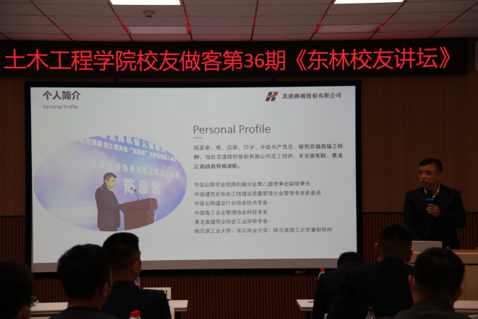 【主讲人:陈彦君】正高级工程师,国务院、黑龙江省政府特殊津贴获得者,1988年毕业于我校森林道路与桥梁工程专业。现任龙建路桥股份有限公司总工程师,兼任哈工大、东北林大、哈理工等高校的企业导师,并作为技术专家服务于中国施工企业管理协会、中国建筑业协会、中国公路学会等。