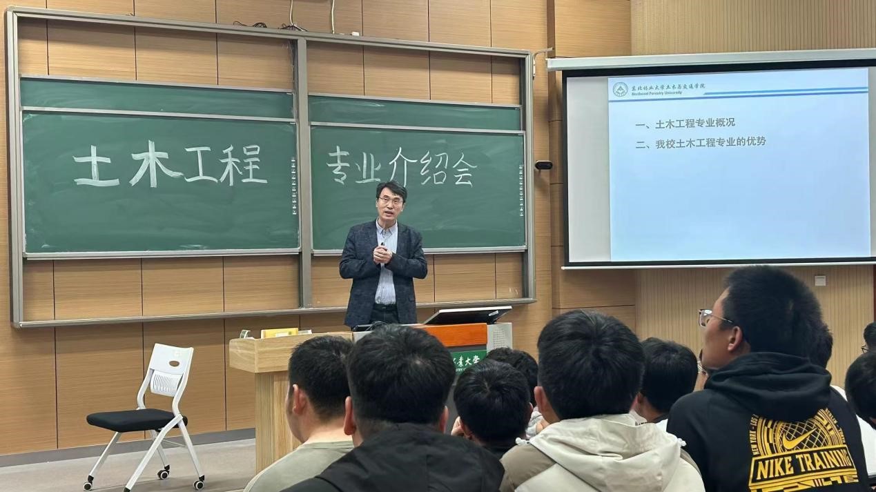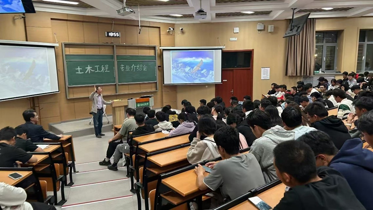 会上,李国东副教授聚焦于专业概况以及我校土木工程专业优势这两个关键问题展开解答。除详细讲述土木工程专业办学历程、本科生培养体系、学科基础设施建设与升学就业等相关问题外,李国东副教授还强调到“土木工程,作为一门历史悠久且历久弥新的工科专业,其影响力深远而广泛。在党的坚强领导下,步入新时代征程,该专业更是迎来了蓬勃发展的黄金时期。它不仅关联着民众日常生活的‘衣、食、住、行’基本需求,成为社会稳定与民生福祉的坚实基石,更紧密地融入并服务于国家发展战略之中,展现出与时代脉搏同频共振的青春活力。”随后,李国东副教授展示了我校底蕴深厚的办学实力、先进完备的研究设备、高质量的教师团队。这些优势资源如同坚实的基石,共同构筑了一个广阔而充满活力的平台,为每一位同学今后学习和成长提供了强有力的支撑和保障。