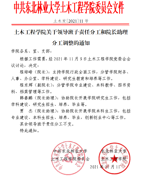 yl23411永利集团官网关于领导班子责任分工和院长助理分工调整的通知