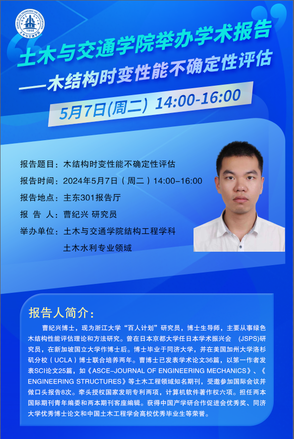 曹纪兴博士,现为浙江大学“百人计划”研究员,博士生导师,主要从事绿色木结构性能评估理论和方法研究。曾在日本京都大学任日本学术振兴会 (JSPS)研究员,在新加坡国立大学作博士后。博士毕业于同济大学,并在美国加州大学洛杉矶分校(UCLA)博士联合培养两年。曹博士已发表学术论文36篇,以第一作者发表SCI论文25篇,如《ASCE-Journal of Engineering Mechanics》、《Engineering Structures》等土木工程领域知名期刊,受邀参加国际会议并做口头报告8次。牵头授权国家发明专利两项,计算机软件著作权六项。担任两本国际期刊青年编委和两本期刊客座编辑。获得中国产学研合作促进会优秀奖、同济大学优秀博士论文和中国土木工程学会高校优秀毕业生等荣誉。